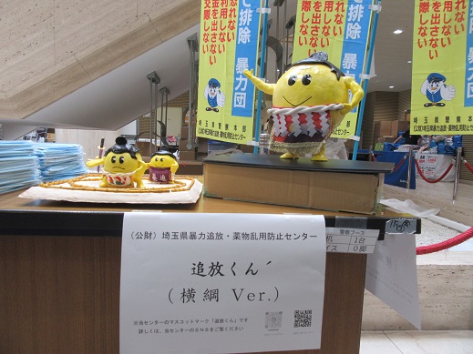 大相撲川越場所では、当センター・埼玉県警察本部・川越警察署職員のほか、巡業力士らの協力を得て、入場者に対し啓発品の配布と併せ、追放くん´(ダッシュ)の新作「横綱Ver.」を会場内に展示するなど、暴力追放・薬物乱用防止の啓発を行いました。